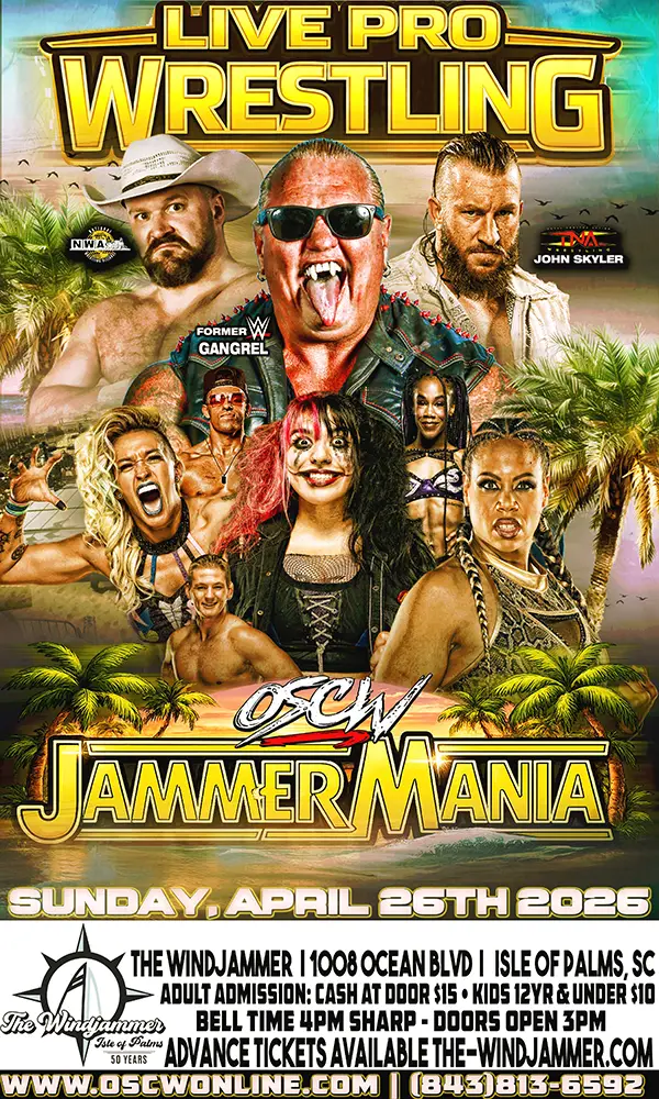 We have a great card scheduled with appearances by Fomer WWE Star Gangrel, TNA TV Stars John Skyler (OSCW Champion) and Jada Stone Former, Former TNA TV Star Savannah Evans and NWA Stars The Country Gentlemen (OSCW Tag Team Champions) and The Stew Crew. Plus, we have several who have made recent AEW and/or WWE appearances like the OSCW IC Champion Chase Emery and Don Furio and Dani Mo. We also will have many of the best independent wrestlers from all over the southeast coming into the Low Country to participate.